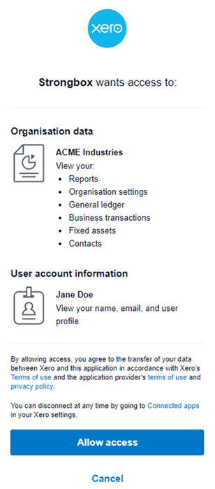 Once you log in, Xero will provide a list of the information that Strongbox requires access to.